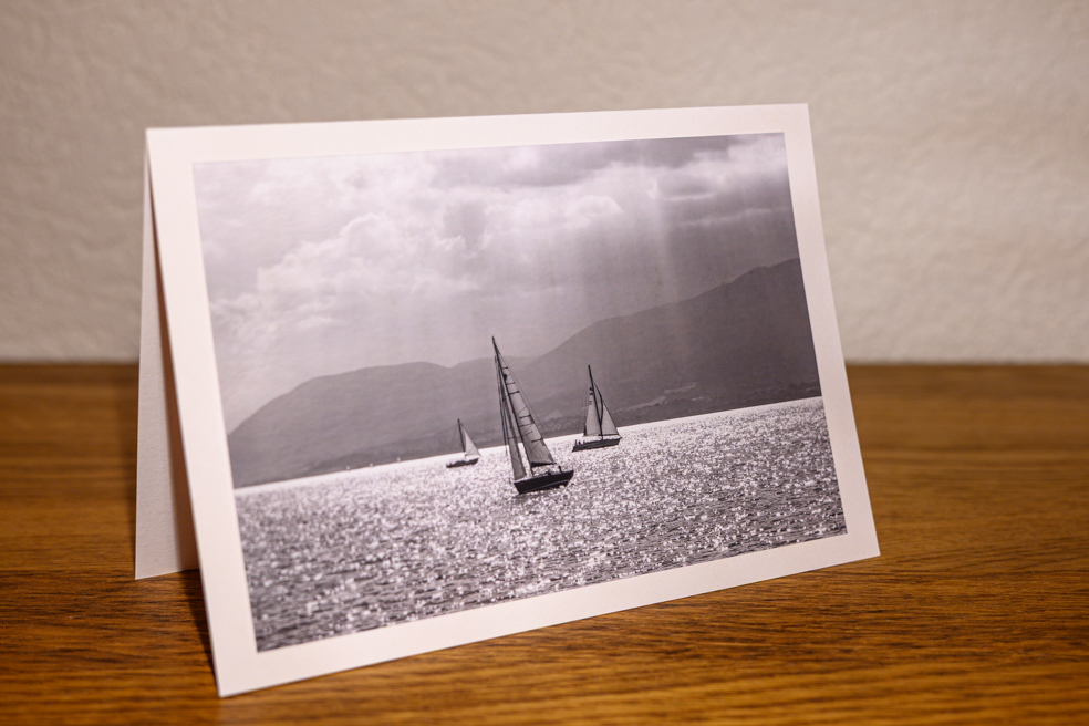 Cette carte de condoléances présente une scène intemporelle en noir et blanc : des voiliers glissant doucement sur un lac paisible. Le contraste entre l’eau et le ciel crée une atmosphère de calme et de sérénité, invitant au recueillement et à la réflexion.